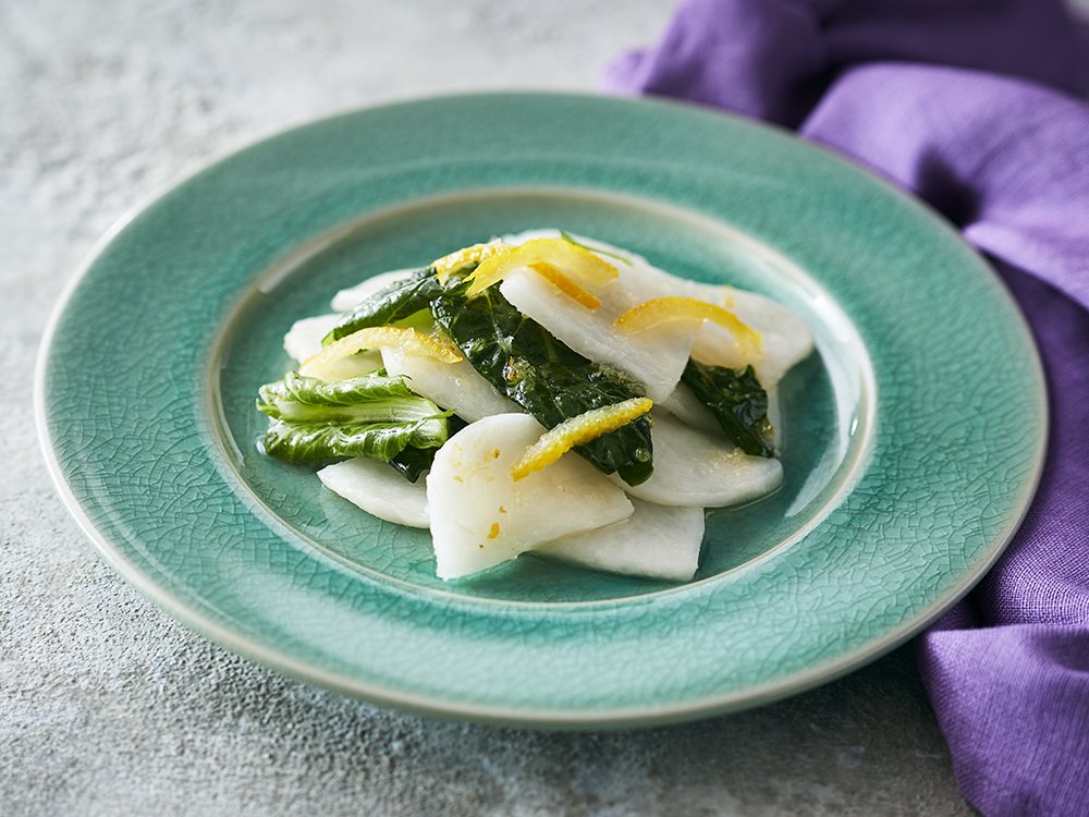 小かぶの食感と甘みを感じられるサラダです。酢やごま油、砂糖でさっぱりとした味わいに、ゆずの香りとほろ苦さがアクセント。食卓の副菜としておすすめです。